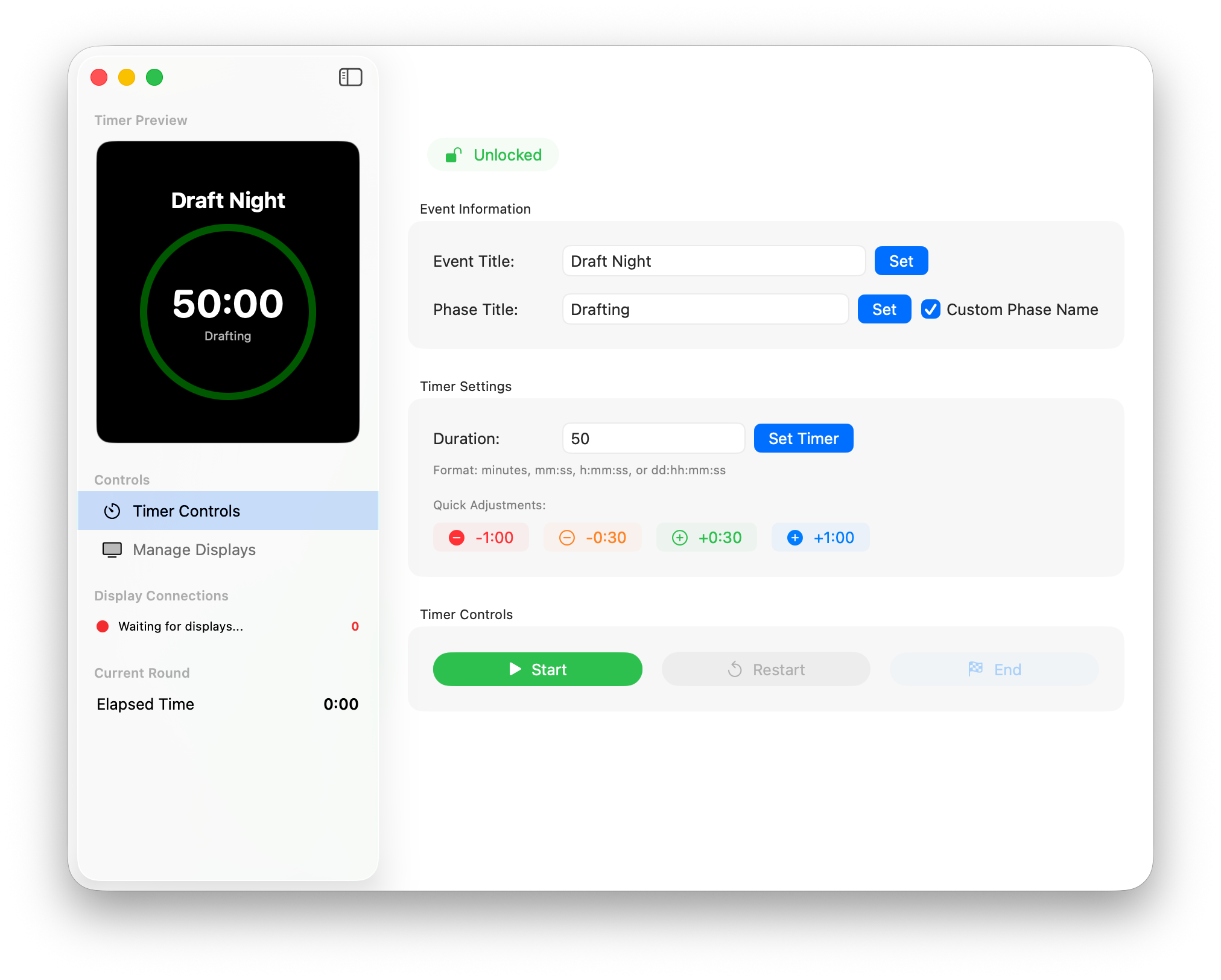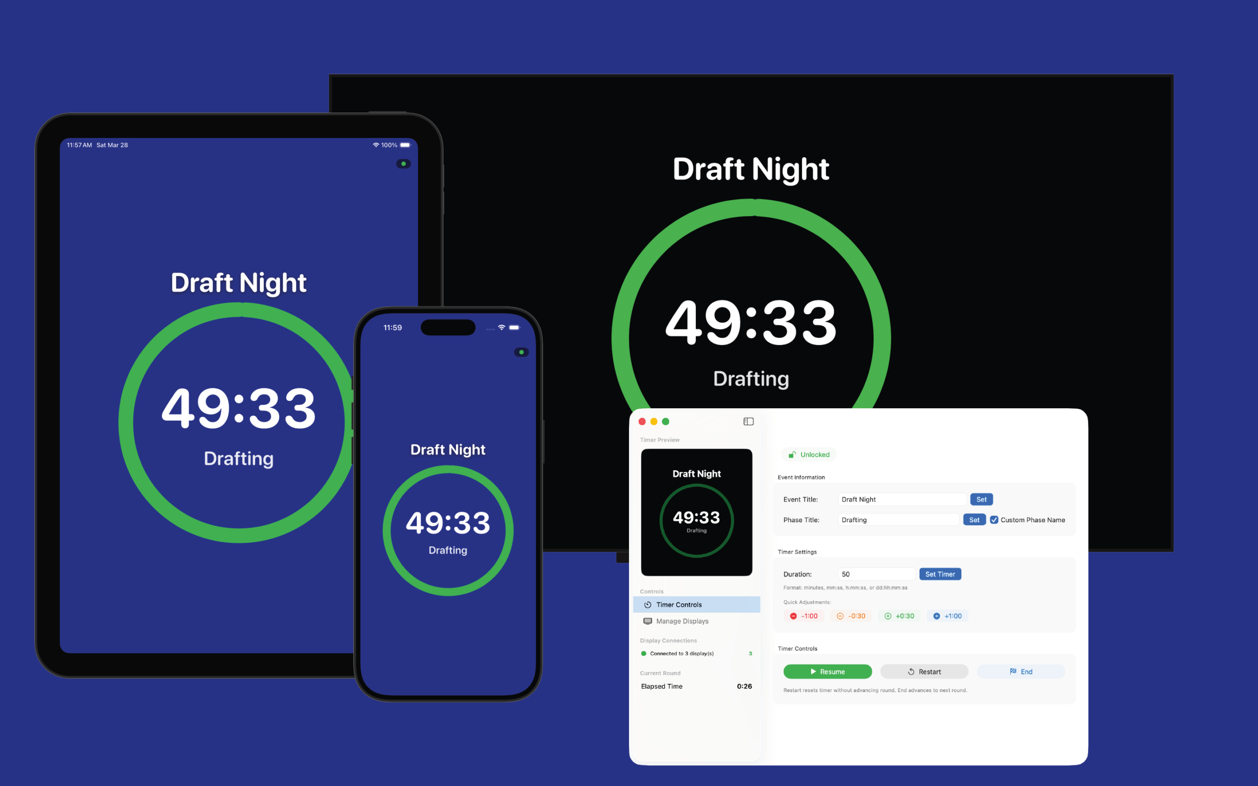 RoundCast Console is the macOS application that drives our timers. It includes flexible controls to customize the event name and phases.