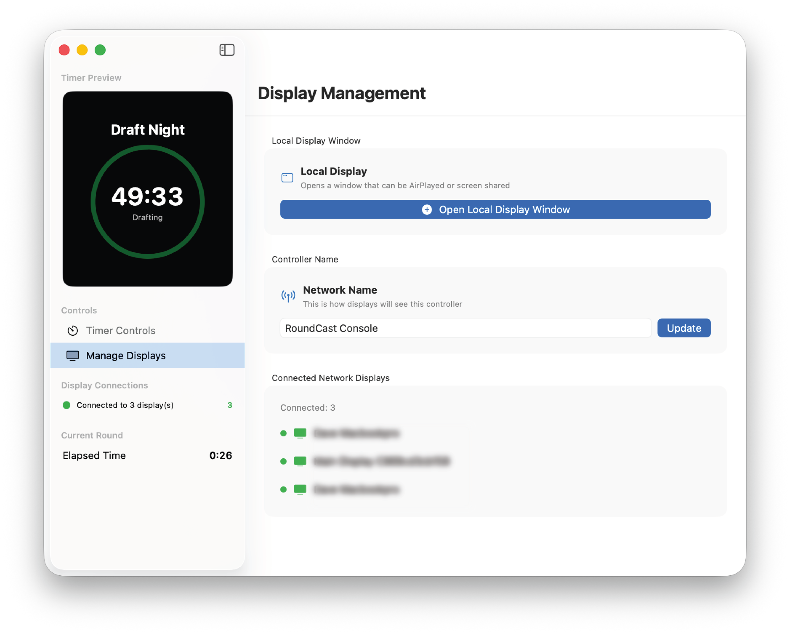 The Display Management Tab allows you to launch to Local Display Window and configure the Network Name used by your Console. RoundCast support having multiple consoles running on different Macs on the same network. By providing clear network names, you'll be able to easily navigate to the correct timer on each RoundCast Player you have running.